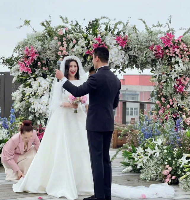 从网上的婚礼现场图可以看到,婚礼是露天型的,而且前来参加婚礼的人不多,应该是出于安全考虑,所以只请了一些关系很好的亲朋好友。