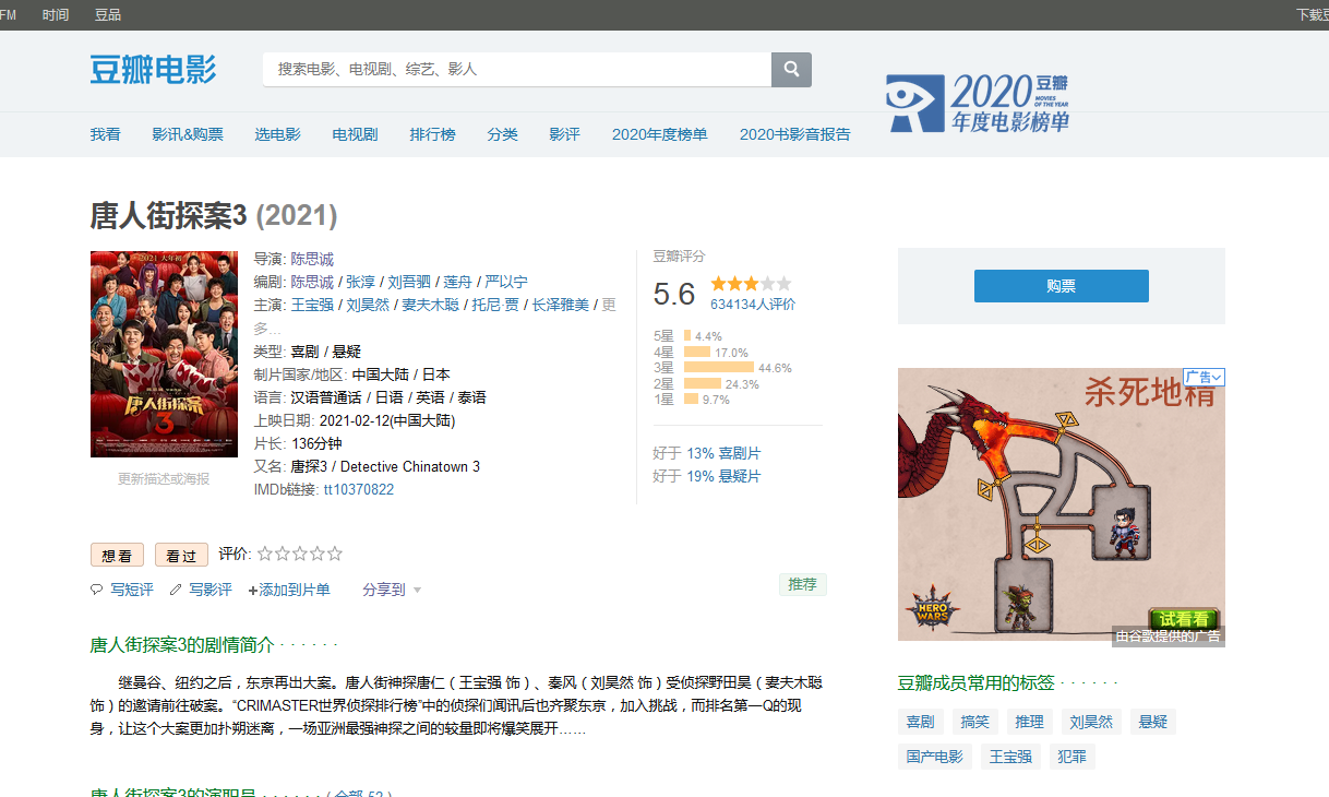 IMDB的评分就要比豆瓣苛刻得多,及格偏下。豆瓣评分低确实有黑子和粉丝因为达不到预期怒打一星的可能,但是《唐探3》也就是一部勉强及格中规中矩的电影而已。如果不了解IMDB的可以自己百度一下,如果你非要杠说什么国外的网站不能相信,那你还是去看你的猫眼吧。