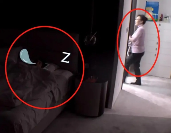 在儿子与儿媳都还未睡醒的状态下,脱下鞋子蹑手蹑脚地进入他们的房间。