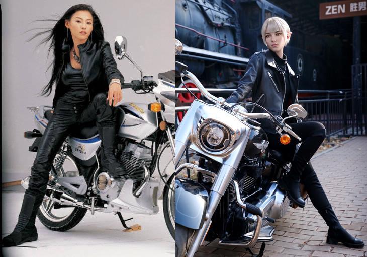 甚至还有网友说,胜男真的是酷似张柏芝呀!甚至就连衣服都跟张柏芝先前穿过的衣服有5分相似!另外胜男在摩托车跟前拍的照片,也跟当年张柏芝为某个摩托车所代言拍的照片神似!
