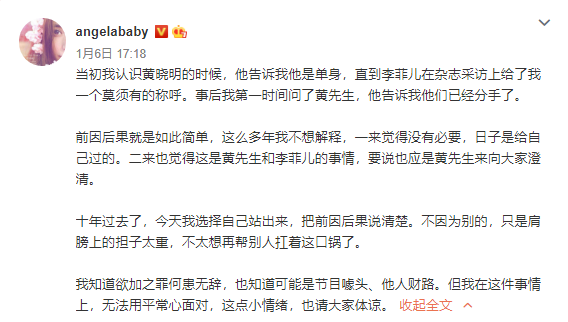 现在凹独立自强新女性姿态的杨颖,和黄晓明解绑的意图愈发明显。1月份,因黄晓明和旧爱李菲儿《浪姐2》同台互动,杨颖公开发博手撕亲(qian?)夫,昔日的“晓明哥”,今天的“黄先生”,称呼的变更透着凉薄,而搬出10年前的黑料澄清——“不太想帮别人扛着这口锅了”——又透着恩断义绝的狠。