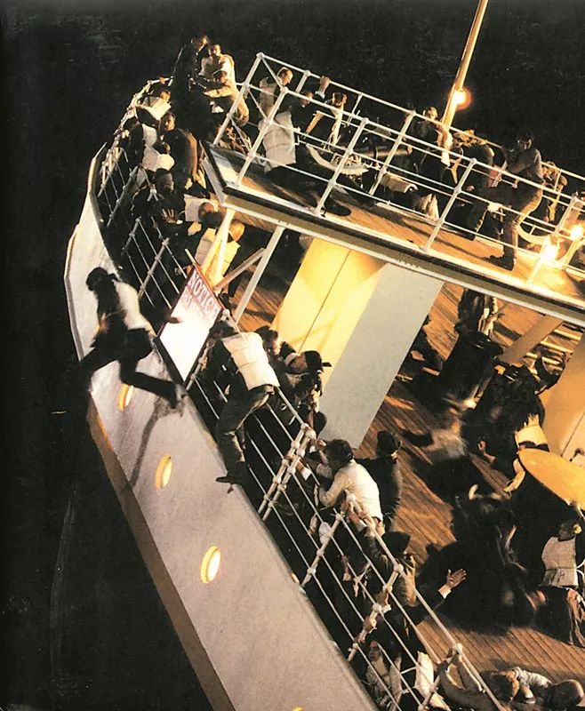 有一个镜头是这样的:船尾慢慢翘起,此时1500个演员加上工作人员要顺着逐渐倾斜坡路向倾覆的船尾跑去。