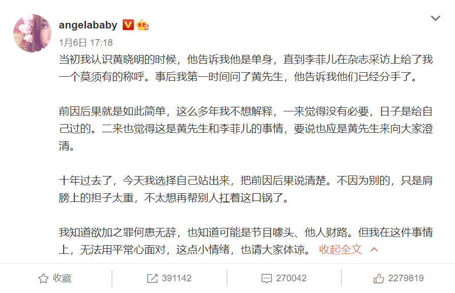 《浪姐2》黄晓明与李菲儿、baby昔日旧情被爆上热搜,baby发长文否认自己是小三,甩锅黄晓明。