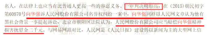 还有一个是他替向华强诉官媒,将人民网告上法庭,理由就是,该网站发布的文章说向华强涉黑。