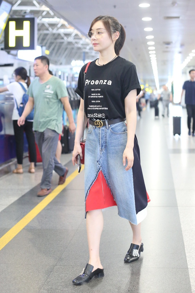 底下搭配的这条裙子可谓短长常亮眼了,黑红拼接的裙子明艳的颜色非常好的提亮了肤色,为了凹造型,袁姗姗还把一条剪开的牛仔裤缝在裙子上头,怪异新鲜时兴到不可,玄色皮腰带的装修也是非常好的拉长了身型,一双玄色小皮鞋走在机场中分外吸睛。