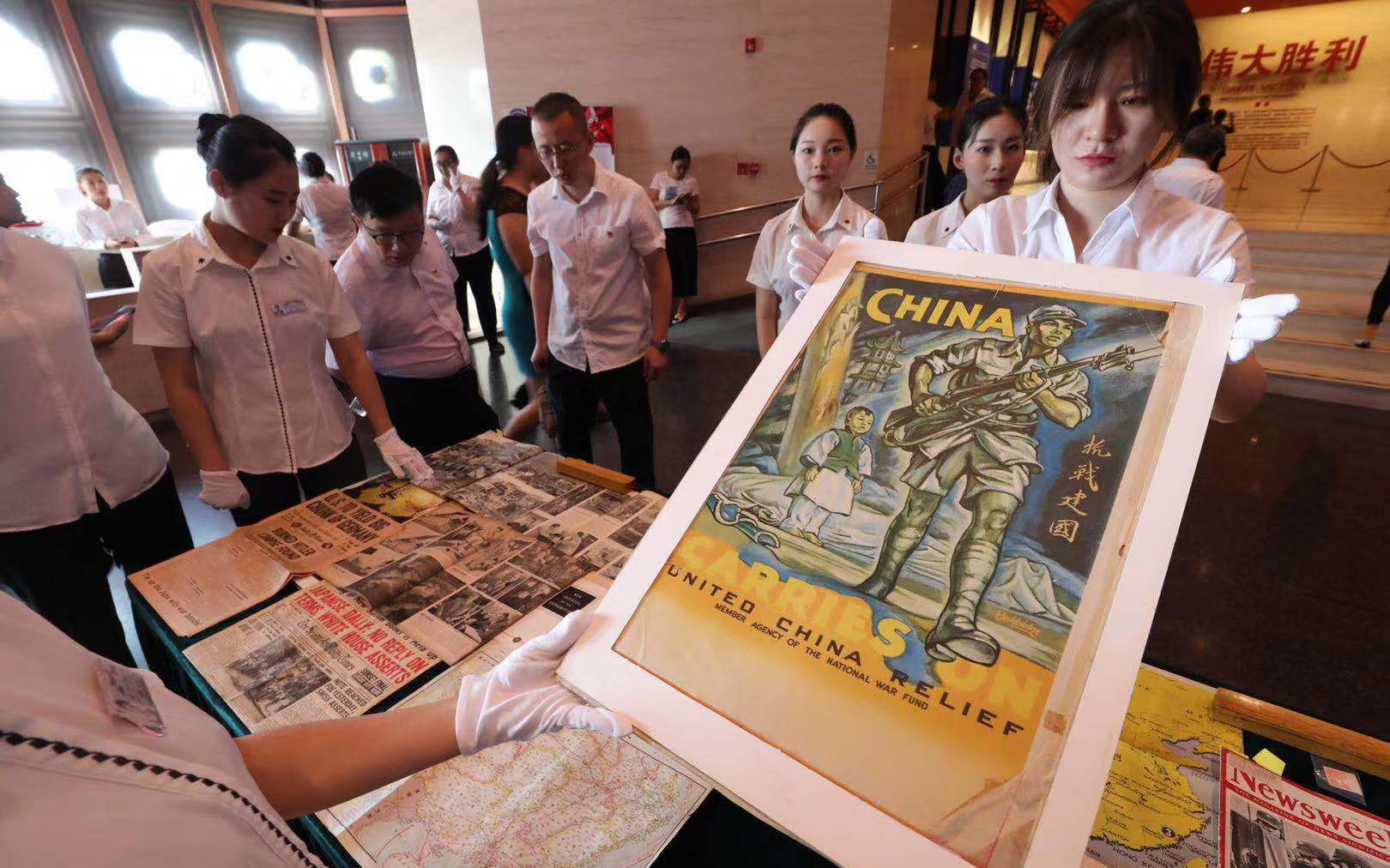 抗战馆获赠美国发行的抗战宣传海报。摄影/新京报记者 浦峰