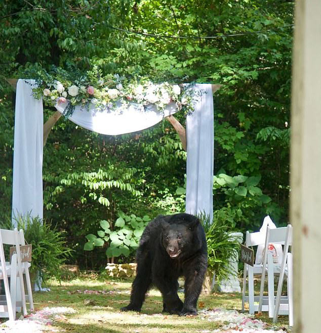 【环球网综合报道】据英国《每日邮报》9月29日报道,近日,在美国田纳西州一对新人科里(Cory)和萨琳娜·布鲁尔(Sarina Brewer)的婚礼上,一只黑熊走上了婚礼的红毯抢尽了风头。摄影师利娅·麦克马汉·埃德蒙森(Leah Mcmahan Edmondson)用镜头记录下了这个画面, 随后将这个有趣的故事和照片分享在了脸书(Facebook)上。