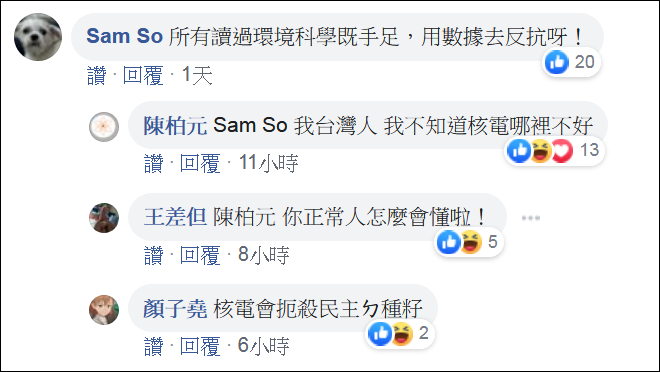 问:“我是台湾人,我不知道核电哪里不好”,答:“核电会扼杀民主的种子”。