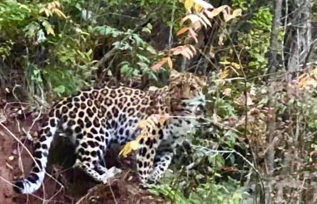•近日,陕西黄陵国家森林公园员工和游客从北区停车场乘车回南区,半路偶遇一头小豹子。