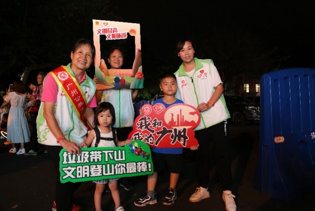 记者现场看到,不少志愿者都准备了一些标语供市民拍照打卡,如“文明登高,文明旅游”、“垃圾带下山,文明登山你最棒”、“敬老爱老我最棒!”、“我和我的广州”,以新鲜有趣的形式提醒市民注意安全游玩、提倡文明登山,并号召大家随手带走垃圾。担任白云山重阳登高志服务愿者近十年的张大姐表示,今年全市垃圾分类开展火热,山顶公园也特别重视这项工作,“及时提醒市民做好垃圾分类,尽量把垃圾带下山,让环境时刻保持干净整洁”。