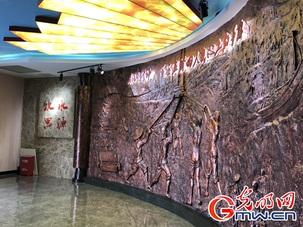 展厅中,一张图片记录下当时两万七千名参建干部群众,像蚂蚁一样奋战在水库现场。据教育基地讲解员介绍,当时参建者们不惧严寒酷暑,白天一片人,晚上一片灯,工地上歇人不歇工,日夜抢战。工地战斗口号:“大雨巧干、小雨大干、阴天晴天猛干”“水涨一寸,坝高一尺”。
