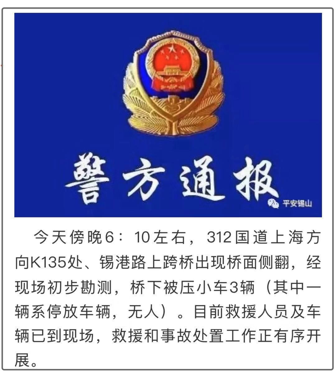 10月10日晚,江苏省无锡市公安局锡山分局发布通报,傍晚6时10分左右,312国道上海方向K135处、锡港路上跨桥出现桥面侧翻,经现场初步勘测,桥下被压小车3辆(其中一辆系停放车辆,无人)。目前救援车辆已到现场,具体伤亡情况也在统计当中。