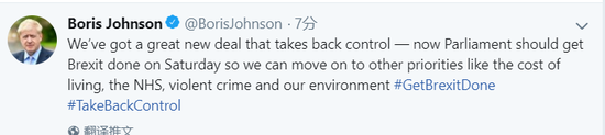 当天,英国首相约翰逊也在社交平台宣布,“我们已经得到了一份新协议,英国议会应该在周六通过协议。”同时,他表示这项“伟大的新协议”有助于“收回控制权”。