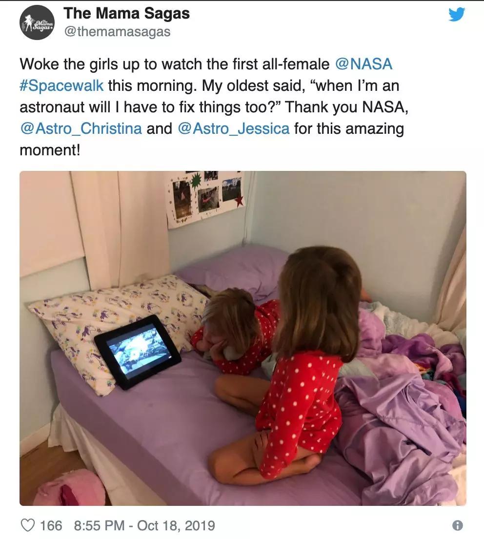 一位推特网友称,她特意叫醒了自己的两个小女儿起来观看此次全女性太空漫步,她的大女儿还问“当我成为一名宇航员时,我也需要修理东西吗?”