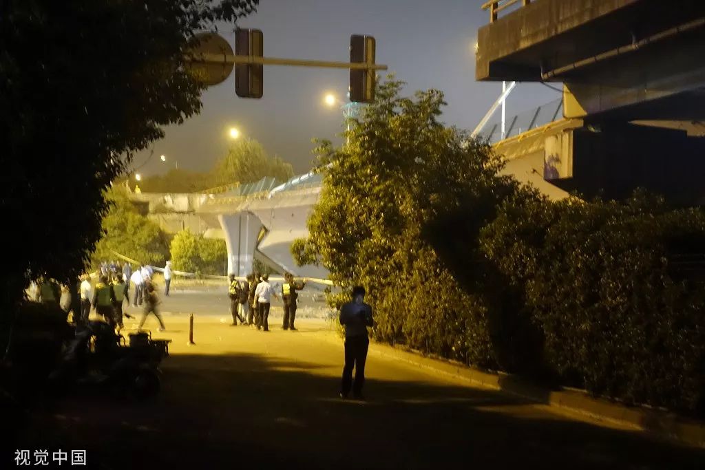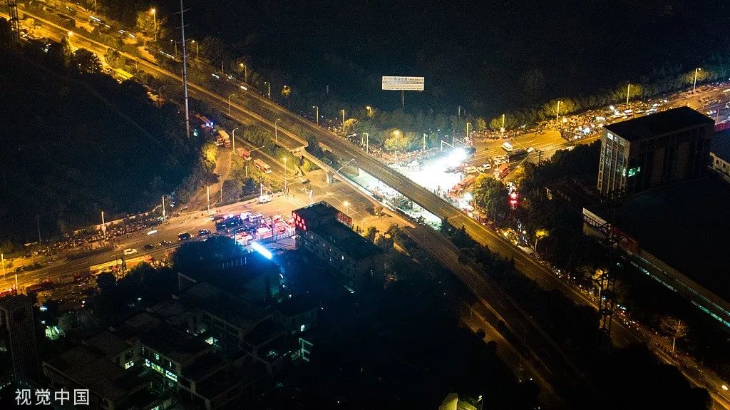 ▲2019年10月10日晚,江苏无锡,312国道上海方向锡港路上跨桥路段出现桥面垮塌,现场有多辆轿车被压,具体伤亡情况不详。救援车辆已抵达现场。航拍现场。