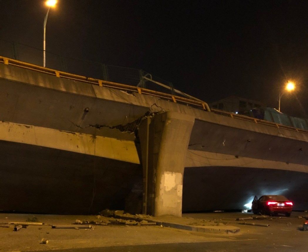 网传视频显示,夜色中,一座高架桥突然发生侧翻,有车辆被垮塌的高架桥压住,侧翻的桥面上还有正在行驶的车辆。一辆蓝色车辆正准备驶入事发位置,驾驶员紧急刹车,并下车向后跑躲避。