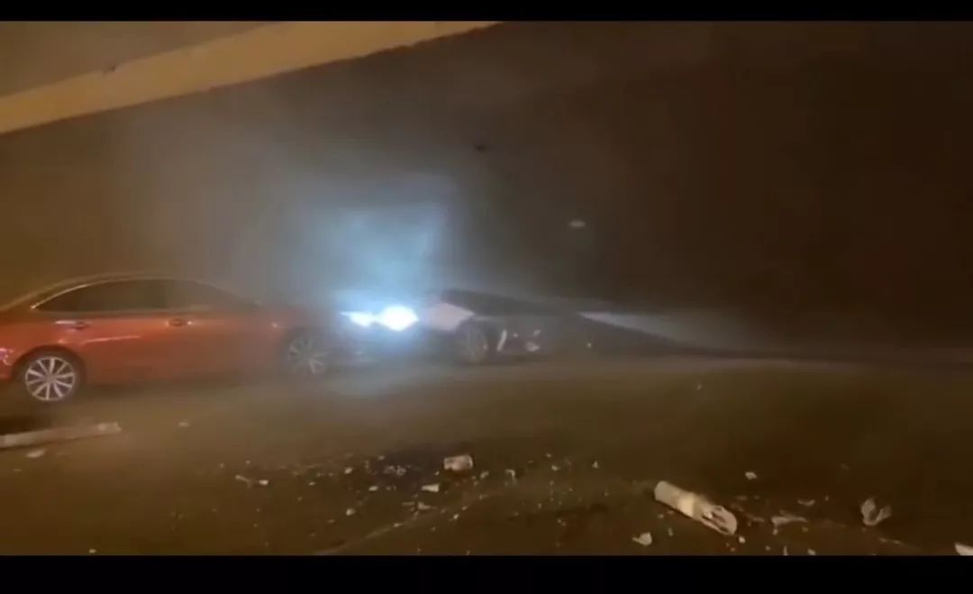 有过往车辆的行车记录仪拍下事发瞬间。画面显示,有车辆正从桥下左转进入行车道,整幅桥面瞬间落下,将多辆车压住。