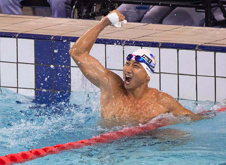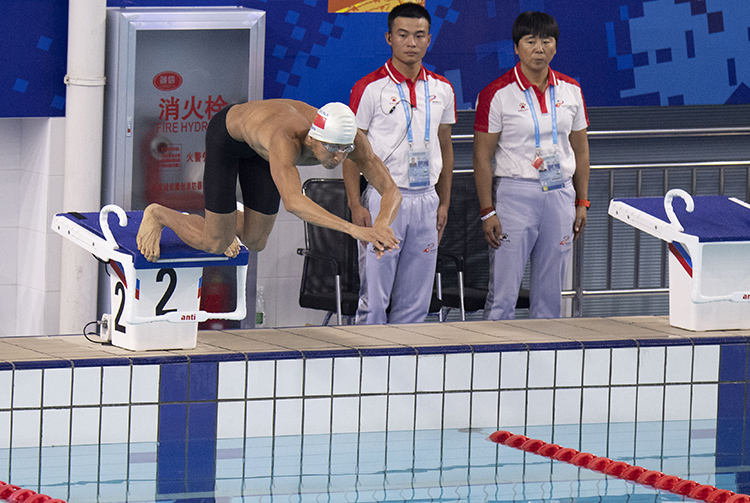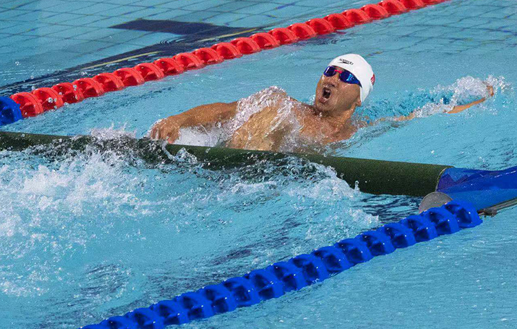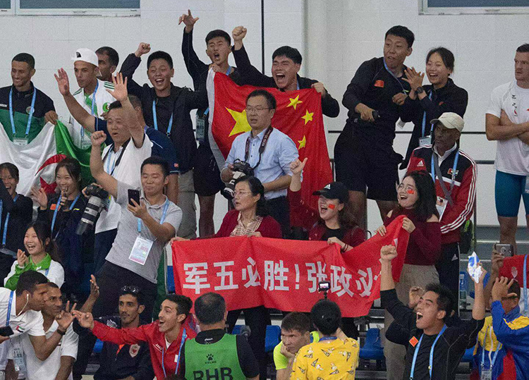 中国选手张政以23.8秒获得男子军事五项障碍游泳赛第一名。