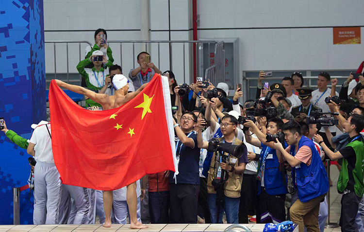 中国选手张政获胜后身披五星红旗庆祝胜利。