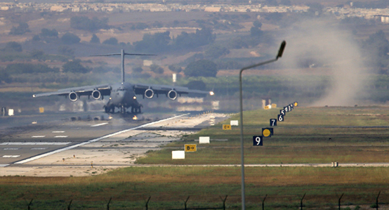 在因吉尔利克基地起飞的美国空军C-17运输机。