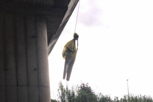 一些网友在社交媒体上上传了这张悬吊人偶的照片。当地警方表示,该行径存在“严重威胁”并展开调查。