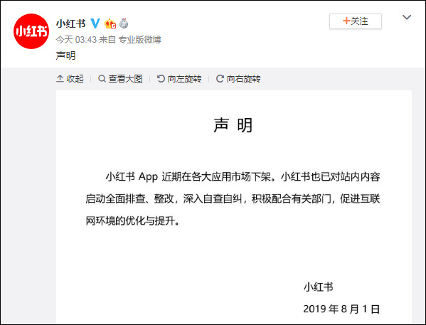7月29日,小红书App在多家应用商店下架,对于下架原因小红书尚未公布,只是表示“公司已了解到该情况,正在与相关部门积极沟通解决。”随后,小红宣布对站内内容启动全面排查、整改,深入自查自纠。