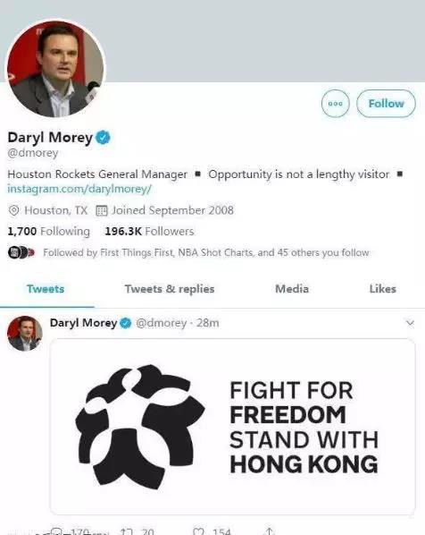 当地时间5日上午,休斯顿火箭队总经理达雷尔·莫雷在推特发布了一张图片,其内容正是近几个月香港示威者常喊的一句口号:“为自由而战,和香港在一起(Fight for freedom,Stand with Hongkong)”↓