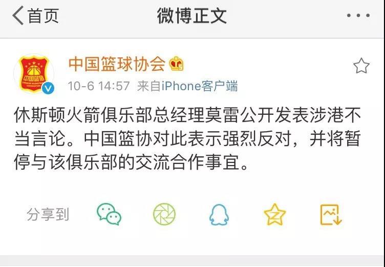 莫雷的立场是对中国球迷的伤害,也是对中国人民的冒犯。中国篮协已作出回应,将暂停与该俱乐部的交流合作事宜。