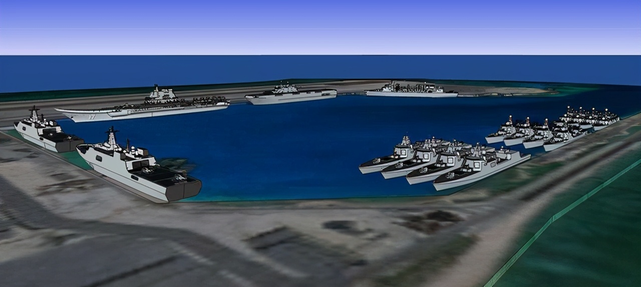 图9:三艘航母战斗群,“一”字排开,停靠在永暑岛,这当然还不是现实的景象,但未来可期总体来看,针对南海的各种造岛和建设才刚刚开始,随着我国南沙区的成立,南海开发的大幕将逐渐拉开。