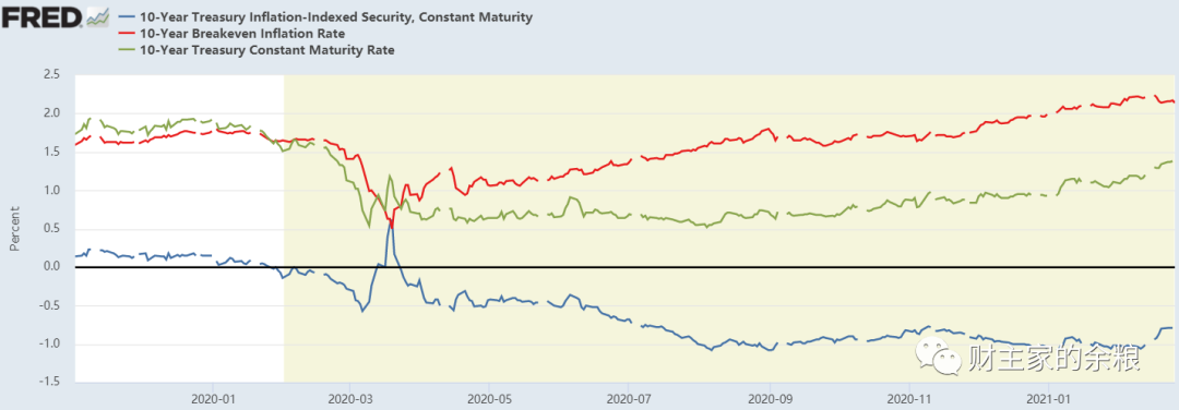 下面这张图,展示的就是美国10年期国债收益率(绿线)、10年期通胀保值债券收益率(蓝线)和预期通胀率(红线,又称为“盈亏平衡通胀率”)2019年底以来的变动情况。