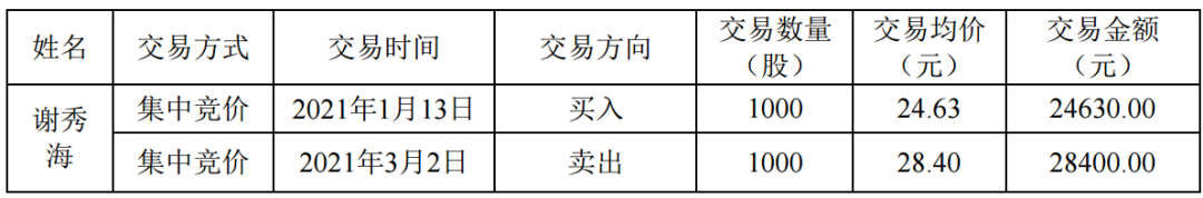 谢秀海先生本次短线交易产生的收益:交易 数量1000股×(卖出价28.40元/股-买入价24.63元/股)-已扣缴税费34.08元=3735.92元。 按照规定,谢秀海先生本次短线交易所得收益3735.92元已上缴公司所有。