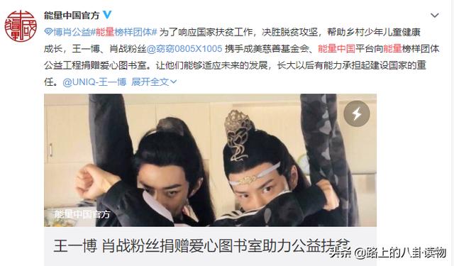 点进去一看,原来是说在一个帮助乡村少年儿童健康成长的公益项目中,王一博及肖战的一名粉丝携手慈善基金会、能量中国平台向能量榜样团体公益工程捐赠了爱心图书室。