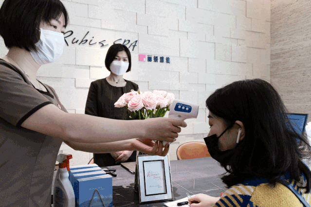 每一位到店顾客,都需要进行体温检测和全身消毒,门店还专门调配了同仁堂的清瘟益气茶饮供客饮,让人能够放心地进入身心享受时间。