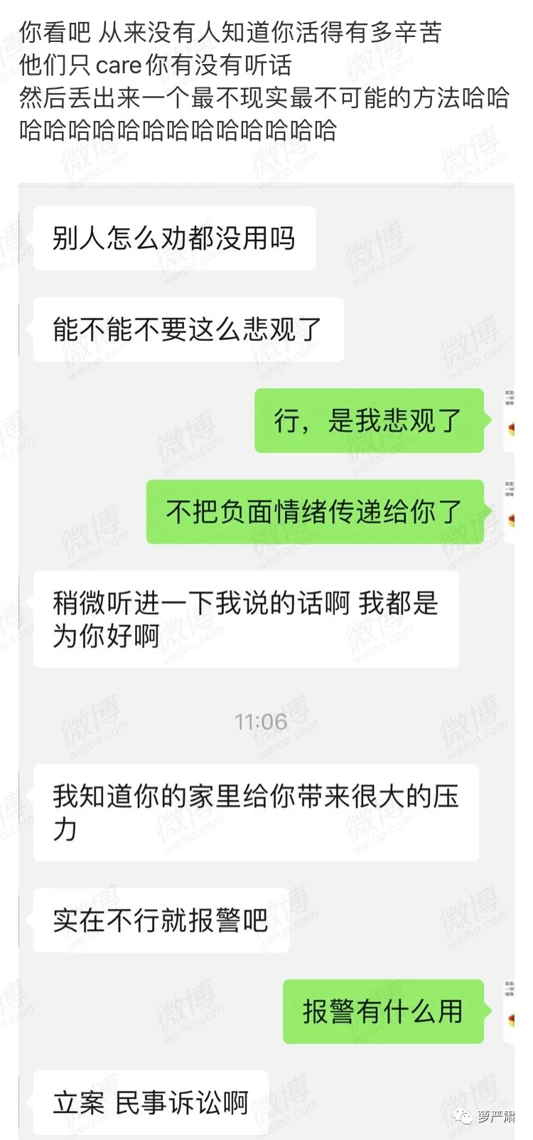 朋友和同事都能从微博上感受到女孩的家庭太过分,给她很多压力。当妈妈一边压榨她一边说“爱”时,女孩说希望花钱买断亲情,从此两不相欠。