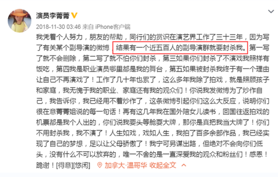3个月后,李菁菁再度曝光自己被“一个近500人的副导演群封杀拉黑”,可她对于自己选择曝光的举动很是义正严词:“我写了就不会删除,写了就不怕你们封杀,不演戏我照样有饭吃,绝不会向你们低头!”